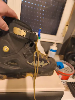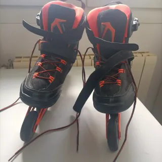 Patines en línea Oxelo de color negro y naranja. Los he usado 2 veces, las ruedas están a estrenar, sin marcas de desgates - Talla 45. - Cierre con cordones y velcro. - Ruedas de 80mm.