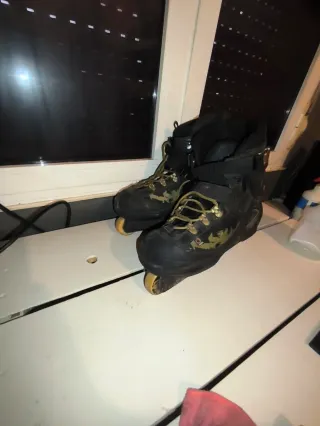Patines en línea de la marca Jack London. Marcas del uso, pero funcionales. - Talla 39. - Diseño negro con detalles blancos hechos a mano - Cierres de velcro y hebilla.