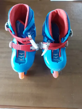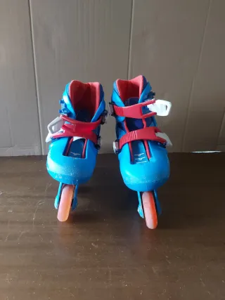 Se venden patines en línea con un diseño llamativo en azul y rojo. - Ruedas de color naranja. - Cierres de velcro y hebilla. Talla 26-28