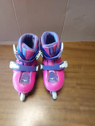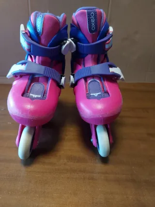 Patines extensibles de la marca Oxelo, ideales para aprender a patinar. - Talla ajustable de 30 a 32. - Color rosa y morado. - Cierres de seguridad.