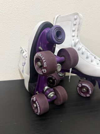 Patines blancos de cuatro ruedas con detalles de la marca Boomerang. - Diseño clásico de bota alta. - Cordones blancos. - Ruedas de color morado.