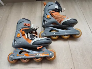 Se venden patines en línea de la marca Decathlon, ideales para iniciarse en el patinaje. - Color gris y naranja. - Cierre con velcro y hebilla. - Ruedas de poliuretano.