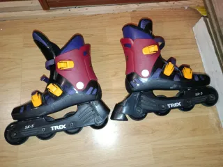 Patines en línea marca Trex, modelo SX-5. Diseñados para ofrecer comodidad y estilo. - Color principal negro con detalles en burdeos y azul. - Cierres de velcro y hebilla. - Ruedas de poliuretano. - Talla L - 39