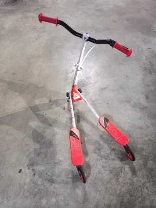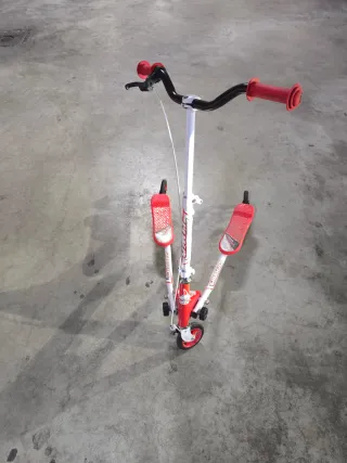 Este patín de tijera tiene un diseño llamativo en rojo y blanco. - Manillar con puños rojos. - Plataformas rojas con textura antideslizante. - Ruedas delanteras y traseras.
