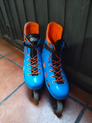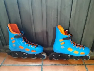 Patines en línea azules y naranjas.
