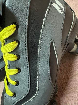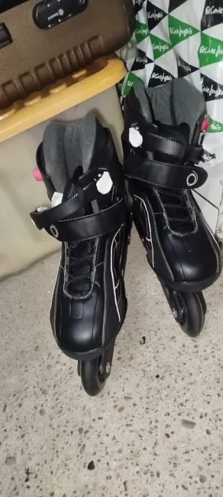 Se venden patines en línea en buen estado, ideales para disfrutar del patinaje. - Color principal negro con detalles grises y amarillos. - Cierre de velcro y cordones para un ajuste seguro. - Ruedas de patinaje en línea.