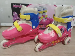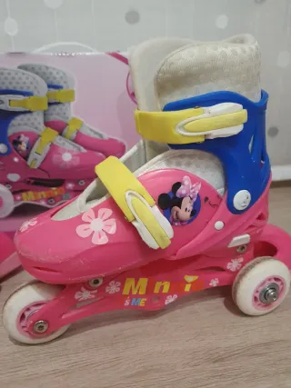 Set de patines infantiles con diseño de Minnie Mouse. Perfectos para iniciarse en el patinaje. -27-30 Talla Ajustable - Diseño en color rosa con detalles de Minnie Mouse. - Cierre de velcro y hebilla para un ajuste seguro. - Ruedas de plástico resistentes.