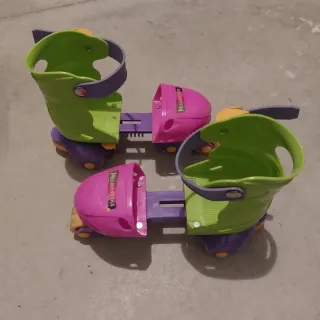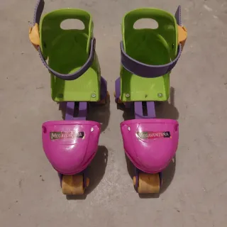 Patines ajustables de la marca Juguettos, ideales para iniciarse en el patinaje. - Diseño en color verde, morado y rosa. - Cierre de velcro para un ajuste seguro. - Ruedas de color amarillo.