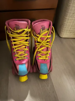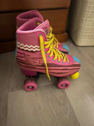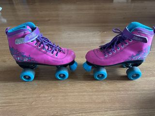 Estos patines de cuatro ruedas son perfectos para deslizarse con estilo. Tienen un diseño llamativo en color rosa y morado. - Cierre de velcro y cordones para un ajuste seguro. - Ruedas de color azul. - Detalle de logo en la lengüeta. Tienen bastante uso.
