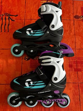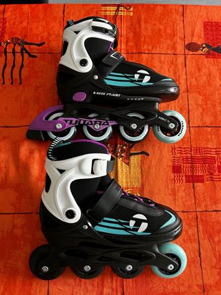 Se venden patines en línea ajustables, ideales para iniciarse en el patinaje. - Talla S (ajustable). - Diseño en negro, blanco y turquesa. - Ruedas ABEC 5. - Con protectores de rodilla y codos. - Con funda para guardar.