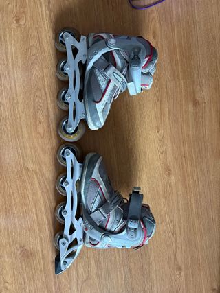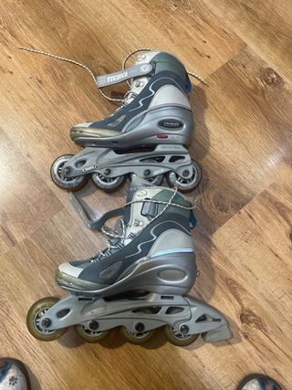 Patines en línea ROLLERBLADE Wing 6, diseñados para ofrecer comodidad y rendimiento. - Diseño en color gris y azul. - Cierre de velcro y hebilla. - Ruedas de poliuretano. Se vende en Santander o alrededores no mando por correo
