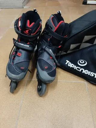 Se venden patines en línea en buen estado, talla 38/39. Ideales para iniciarse en el patinaje. - Color negro con detalles en rojo y azul. - Cierre con velcro y cordones. - Ruedas de 72mm.