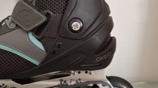 Patines en línea de la marca Oxelo, talla 38. - Diseño moderno con detalles plateados. - Ruedas de goma negra. - Freno en la parte trasera.