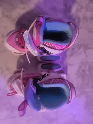 Patines en línea para niña de la marca Oxelo, talla ajustable de 30 a 32. Han tenido muy poco uso. - Diseño en color rosa y morado. - Cierres de hebilla y velcro. - Ruedas de patinaje.