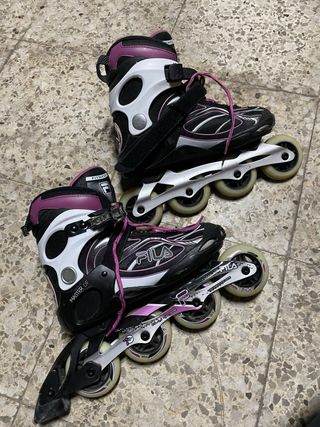 Patines en línea Fila en color negro y rosa, ideales para fitness. - Cierre con cordones, velcro y hebilla. Talla 39.