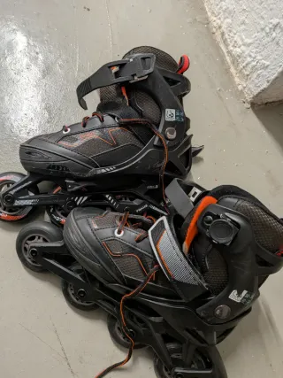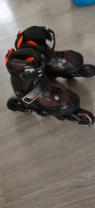 Se venden patines en línea de la marca Oxelo, talla 45. Diseñados para ofrecer comodidad y buen rendimiento. - Color negro con detalles en naranja. - Cierre de velcro y cordones. - Ruedas de 80mm.