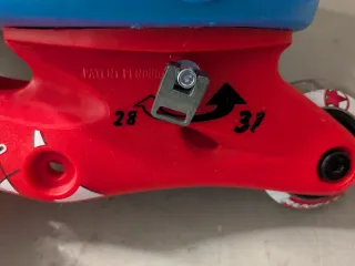 Patines en línea de color azul y rojo, talla 28-30. - Cierre con velcro y hebilla. - Ruedas de color rojo.