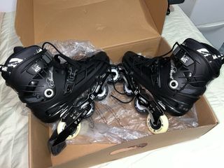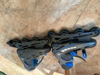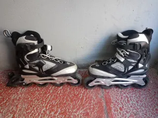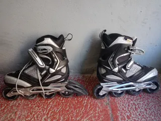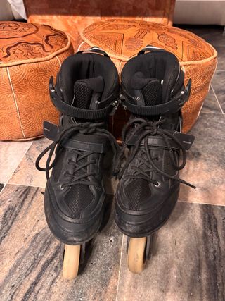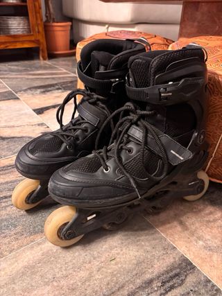 Se venden patines en línea en color negro. Son cómodos y seguros para patinar. - Cierre de velcro y cordones. - Ruedas resistentes.
