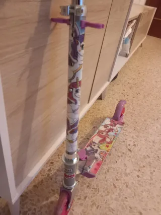 Patín infantil con un divertido diseño de unicornios. - Puños acolchados de color rosa. - Base decorada con unicornios y estrellas. - Ruedas de color rosa. - Plegable y fácil de manejar.