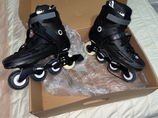 Se venden patines en línea con un diseño moderno en blanco y negro. - Ruedas de alta calidad. - Marco metálico resistente. - Cierre seguro para mayor estabilidad.
