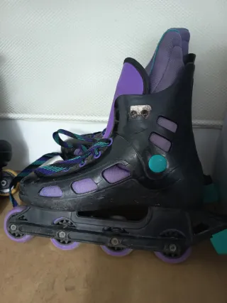 Dos pares de patines para adultos. Talla 39, 40 - Exterior negro. - Detalles en morado y verde azulado. - Cordones a juego. 10€ cada par. También los tengo para niños.
