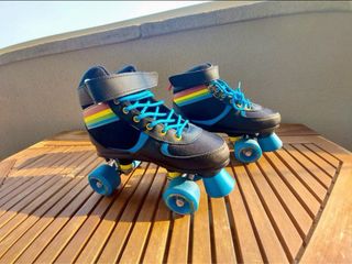 Patines de cuatro ruedas con un diseño llamativo de arcoíris. - Color principal negro. - Cordones y detalles en azul. - Ruedas de color azul.