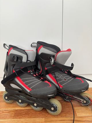 Se venden patines en línea en color rojo y negro, ideales para iniciarse en el patinaje. - Diseño deportivo. - Cierre de velcro y cordones. - Ruedas de poliuretano.