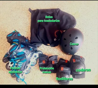 Set de patines Oxelo ajustables, Incluye funda para transportarlos y equipo de protección completo. - Patines ajustables. - Casco. - Protección de manos. - Rodilleras. - Codera. - Bolsa de transporte. -Llaves de ajuste
