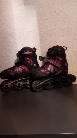 Patines en línea con un llamativo diseño de camuflaje en rosa y negro. Han sido usados una sola vez, por lo que se encuentran en excelente estado. - Diseño de camuflaje rosa. - Cierre de velcro y hebilla.