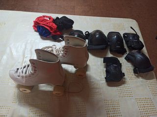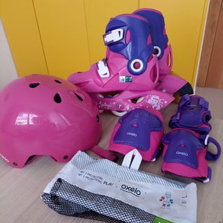 Equipación completa de patinaje. Consta de patines en linea talla 32-34 ajustables,casco talla 50-54 cm y protecciones para rodillas codos y manos talla de 6-10 años.