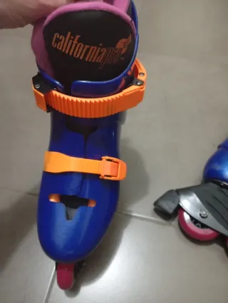 Se venden patines en línea California en color azul y fucsia - Talla 35. - Ruedas color rosa. - Cierre con velcro y hebilla naranja.