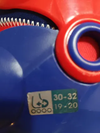 Patines en línea Oxelo en color azul y rojo, ajustables en talla. - Talla 30-32. - Cierre con hebilla y velcro. - Ruedas de patinaje en línea. -Protecciones talla XS -Casco