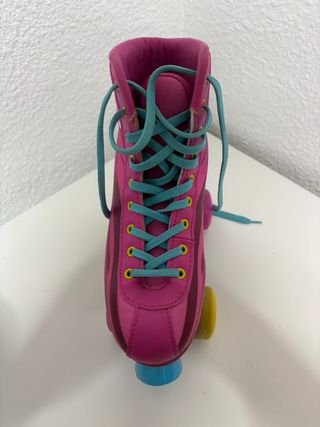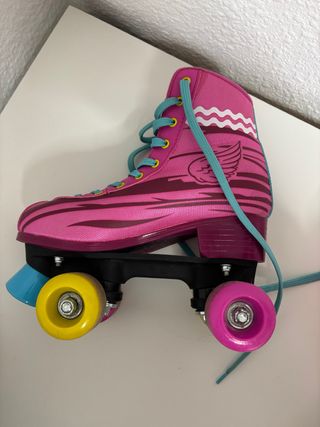 Patines de la popular serie Soy Luna en color rosa. - Diseño con alas y detalles de ondas. - Cordones de color turquesa. - Ruedas de diferentes colores: azul, amarillo y rosa. - Usado dos veces