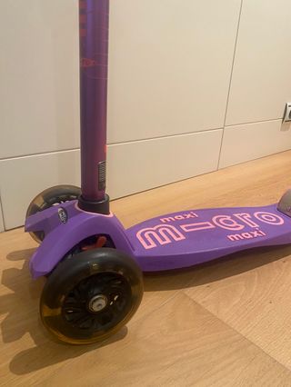 Patín Micro Maxi Deluxe LED en color morado. Ideal para los más pequeños. - Ruedas LED que se iluminan al rodar. - Plataforma ancha y antideslizante. - Altura Regulable | 5-12 Años