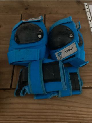 Set de protecciones para patinaje marca Oxelo. - Incluye rodilleras y muñequeras. - Color azul. - Cierre con velcro ajustable.