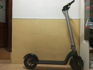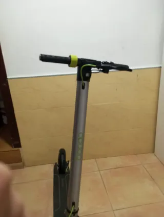 Patinete eléctrico de color gris y negro. - Manillar ajustable. - Ruedas negras. - Cableado verde - corre 26 corre bastante - solo que al frenar hace un ruido - marca Bongo - se carga rápido - te dura todo el día la batería - en muy buen estado - se puede plegar