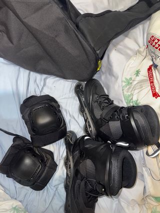 Se venden patines en línea negros, talla 42, junto con un juego de protecciones. Usados una sola vez, los probé y vi que no me gustaba este deporte. No tiene uso - Patines de color negro. - Talla 42. - Incluye rodilleras, y Mochila Transporte.