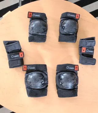 Set de protecciones Oxelo para patinaje o skateboard. El set de 6 piezas Incluye: - Dos coderas. - Dos rodilleras. - Dos muñequeras Diseño anatómico para un ajuste perfecto al cuerpo Material transpirable Carcasa exterior dura Sistema de velcro para un ajuste perfecto de los protectores y para evitar el deslizamiento (rodilla y codo con tiras elásticas de velcro)