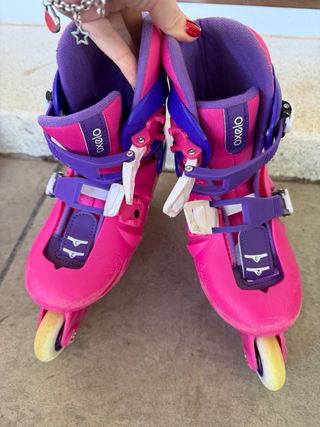 Se venden patines en línea de la marca Oxelo, ideales para iniciarse. - Color rosa y morado. - Cierre con velcro y hebilla. - Ruedas de patinaje.