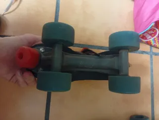 Se venden patines en línea con detalles en color azul y forro interior rojo. - Cordones negros y azules. - Ruedas verdes. - Frenos rojos.