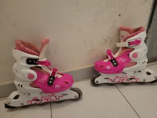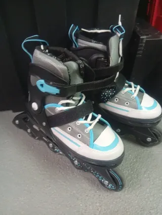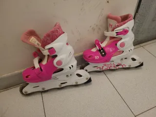 Patines en línea para niña marca Story. Talla adaptable 31-33. - Marco de aluminio -Rodamientos ABEC 9 -Ruedas de 64 mm y dureza 82A. -2 puntos de anclaje (uno de microprecision) y cordones para una mejor sujeccion. -Freno trasero Muy poco uso (menos de un año en pista cubierta), en perfecto estado. Se venden por cambio de modelo.