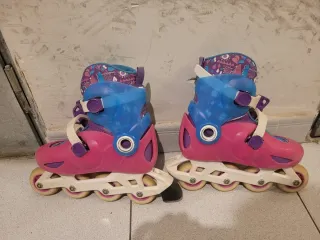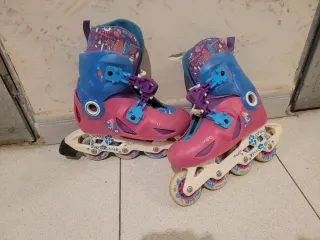 Patines infantiles con un diseño divertido en colores rosa y azul. - Ruedas de patinaje en línea. - Cierre de velcro y hebilla. - Parte superior con estampado. - Botas ajustables. -Talla 30 a 32.
