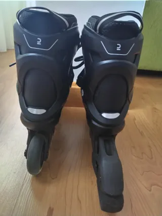 Patines en línea negros, talla 39. Han sido probados una sola vez. - Cierre de velcro y hebilla. - Ruedas de poliuretano. Decathlon