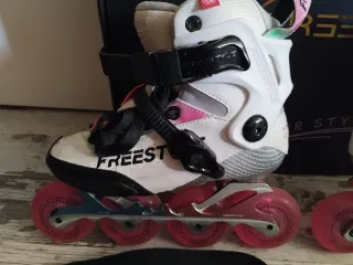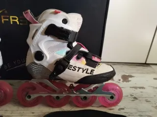 Patines de freestyle en color blanco y rosa, ideales para patinaje freestyle o urbano. Diseñados para ofrecer un buen rendimiento y comodidad. - Bota blanca con detalles en rosa y plateado. - Cierres de velcro y hebilla. - Ruedas rosas de 70 - Marco de aluminio. Talla del 33 al 35 ( va con plantillas)