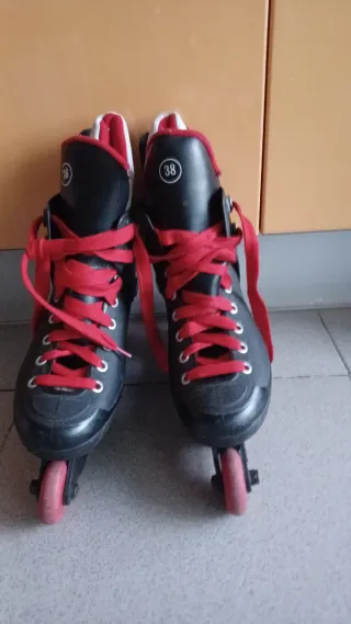 Patines en línea de color negro con cordones rojos y detalles blancos. Son modelo antiguo - Talla 38. - Ruedas de color rojas