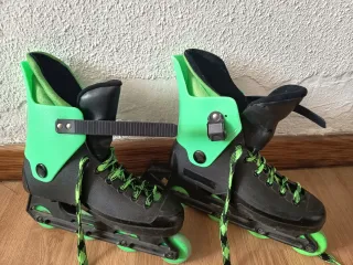 Se venden patines en línea con detalles en verde y negro. Talla 38. - Diseño moderno y llamativo. - Cierre de velcro y cordones para un ajuste seguro. - Ruedas de color verde.