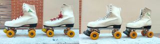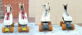 Coleccionista. Ochenteros. Exteriores. Estilo skate roller disco. Marca: Acro Professional. Piel sintética. Talla 40 los amarillos y 39 los negros. 4 ruedas de poliuretano color naranja/ámbar configuradas en rectangular. Bota blanca con cordones rojos uno y blancos el otro. Frenos o topes en negro un modelo y otro en ámbar. Placas y ejes de metal. Opción de compra: Unidad 22€. Peso total: 6Kg. Precio no negociable.