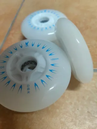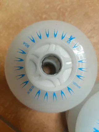 Set de 6 ruedas para patines con luces integradas. Perfectas para patinaje. - Diámetro: 100mm - Dureza: 90A - Diseño con detalles en azul - Incluye luces que se activan con el movimiento en color azul Insisto, son 6 porque son para patines de 3 ruedas Estan como se ven sin estrenar