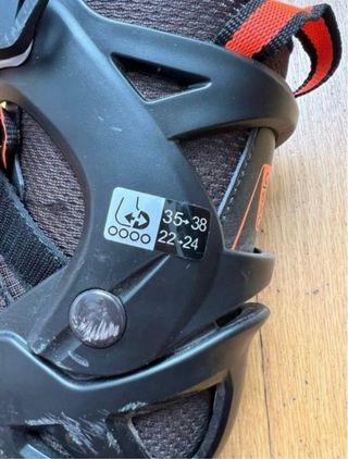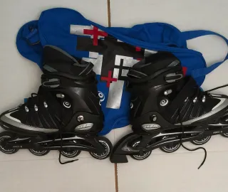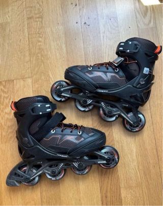 Patines en línea talla 35-38, en buen estado. - Número: 35-38 EU / 22-24. - Color: Negro y naranja. - Diseño cómodo y ligero. Con bolsa para guardarlos y protecciones para codos, rodillas y muñecas (para personas de entre 1,50m y 1,70m)