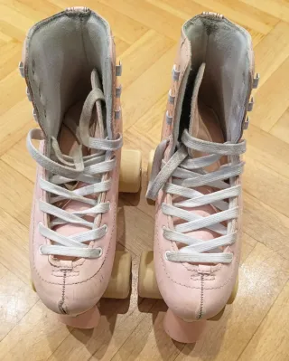 Patines de cuatro ruedas para niña en talla 32. Son de color blanco con detalles en rosa. - Cierre con cordones. - Ruedas amarillas.